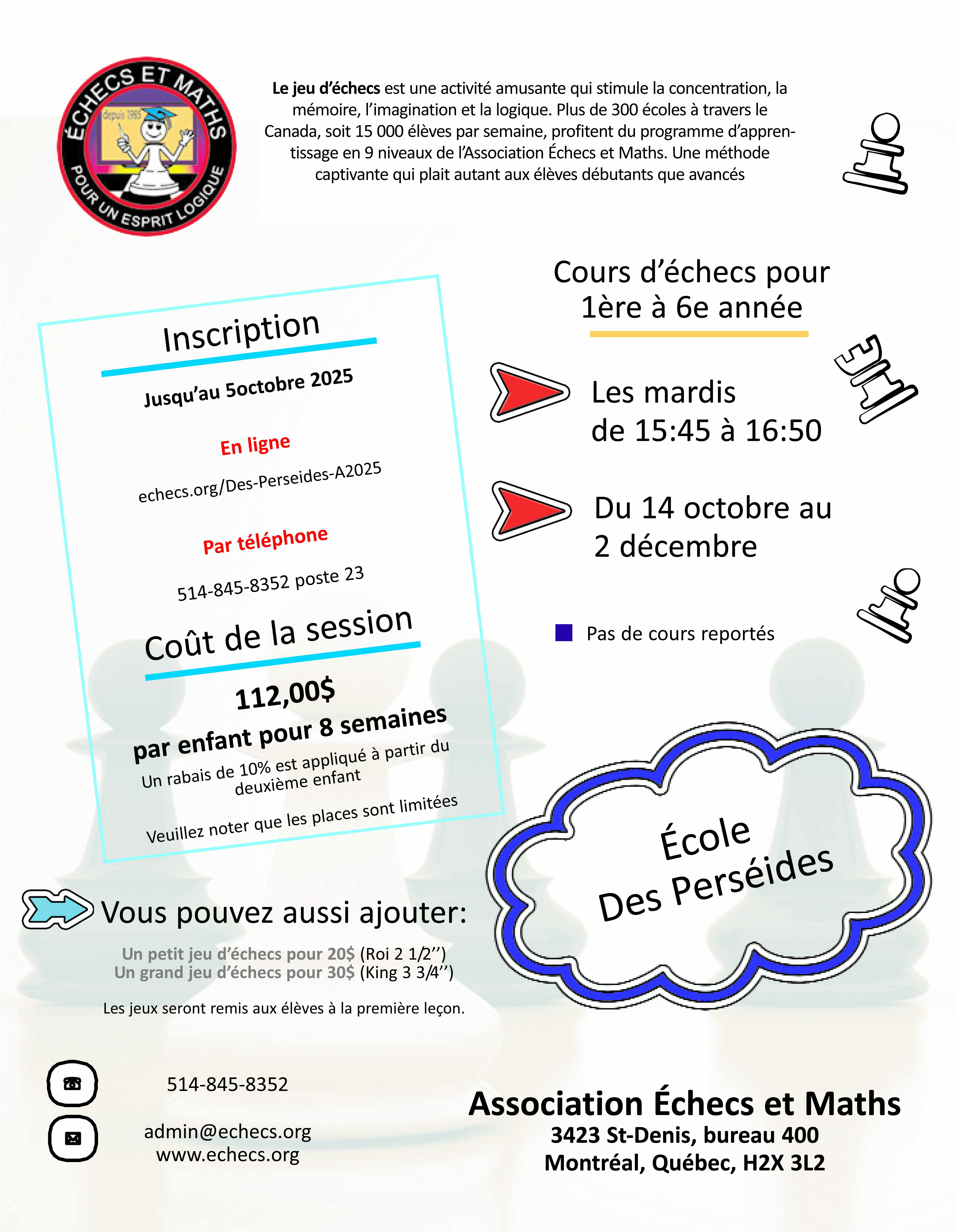 * Ensembles d'échecs disponibles uniquement avec l'achat d'un cours d'échecs.