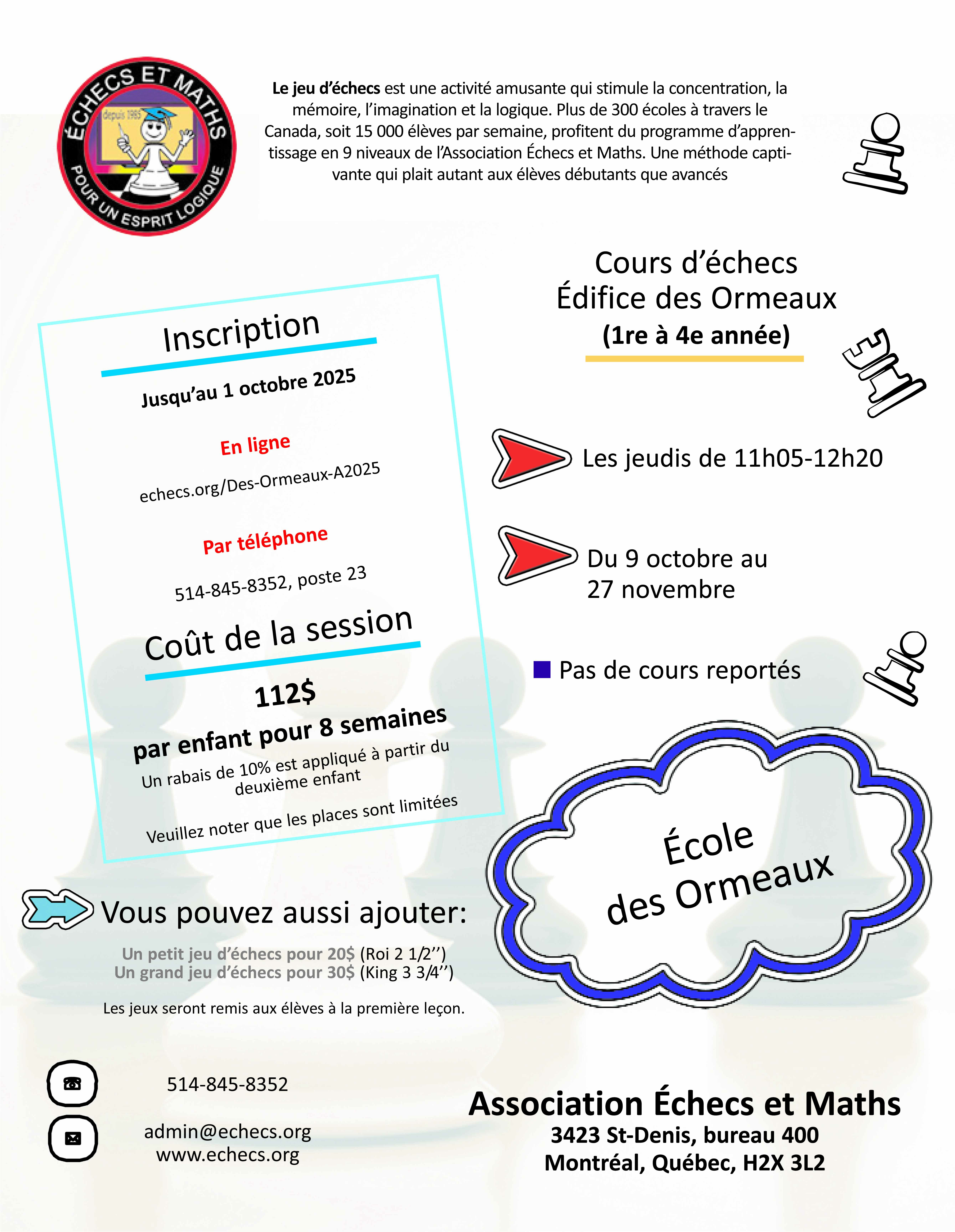 • Lire la suite de Cours d'échecs école des Ormeaux - Édifice des Ormeaux A2025