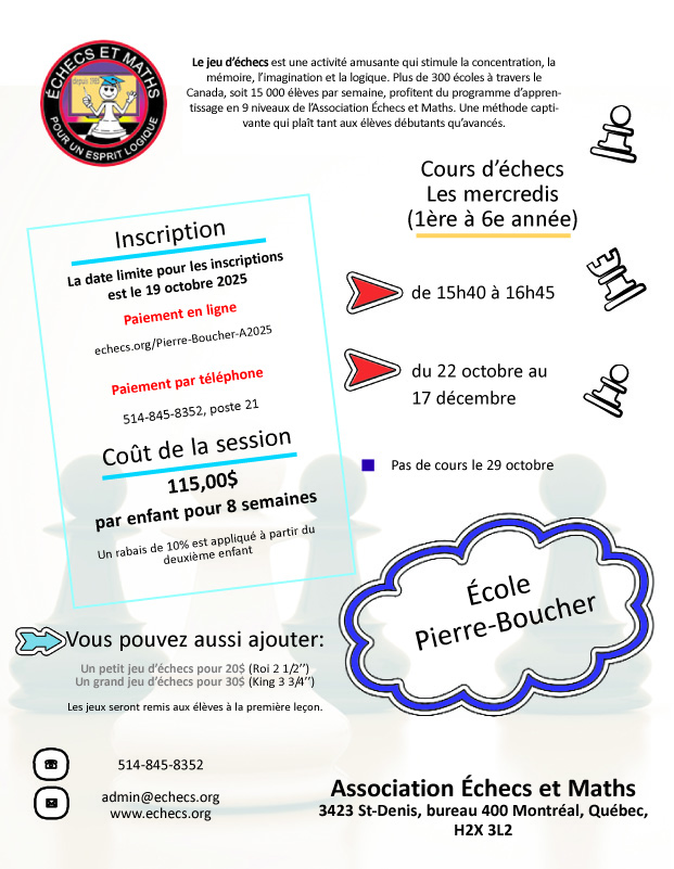 • Lire la suite de Cours d'échecs École Pierre-Boucher A2025